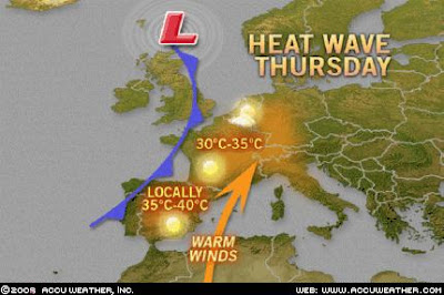 Cooling relief is on the way as the low and it’s cold front is sweeping east and will cool things off for Spain and France. High’s today will take a run at between 95-104 in interior Spain and the Madrid area, whilst Paris and interior France will take a run at 95-100 degrees.