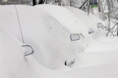 Description: A car drives down my street, unplowed at 7 am. The biggest storm since I moved into my house in 2006, probably biggest in town since 2003. Very impressive with about a foot of snow and drifting.