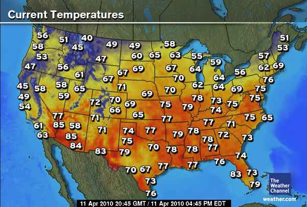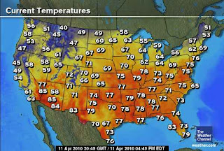 Despite a 98 degrees in Laredo, Tx & a 95 degrees reported at Louisa and Leesburg, Va from the recent heat wave which smashed over 1,000 heat records with some all-time April records fallen. We still haven’t seen the first 100-degree day in 2010. It appears the first 100 is beginning to run a little late as plenty of March’s have seen 100s, particularly over West Texas and the desert of southeast Calif.