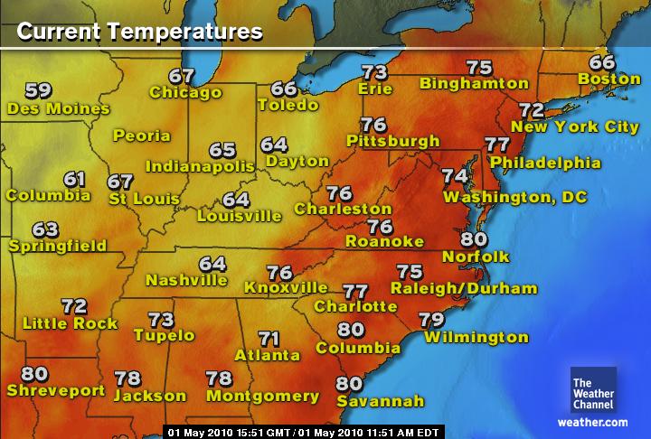 As the trough digs and pushes eastward, we see the warmth which baked Texas into the 90s to 100 degrees for the nations high at Kingville, TX yesterday, the crisp, cool and wintry weather persists across the Rockies.. It’s all about summer-like warmth now for the Eastern states which have seen cool, dissapointing weather return after a blistering warm period at the start of April. That warmth has once again returned as the ridge progresses east, baking the Plains yesterday and now the core of warmth centered from Atlanta to NYC where highs may top 88-90 degrees today all the way to NYC.. It appears DC to Philadelphia have the best chance to see 90 and perhaps an 87 to 88 for NYC. Perfect weather to get outdoors and enjoy a swim in your backyard pool and even invite neighbours round for an evening BBQ or party as temps will remain in the 70s well into the night, perhaps only dropping to around 66 degrees for the low from particularly Richmond, Va to Philadelphia, Pa.