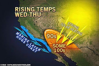 If you notice, though there’s yet another storm system aiming into the Great Basin and rain threatens to spoil the apparent start to summer in California, there’s no stopping summer in the Deep South where highs are now topping the 90 degree mark or warmer from Houston to New Orleans and with a southerly flow up from the soupy Gulf, we have hot, hazy humid conditions now in firm control.