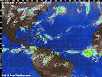 Though no models are showing anything, there are a series of open waves progressing east to west across the ITCZ or Inte-tropical-convergence-zone and all these clusters of cloud and thunderstorms will need to be monitored. We do see a large, fairly strong (in appearence) cluster of thunderstorms that’s just pushed off the west African coast, south of the Cape Verde islands and this looks like a more interesting, eye-catching feature.