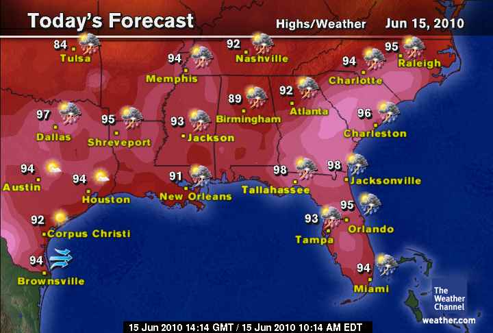 Todays marks a slight change from the past 4-6 days. The Bermuda high is being nudged SE and allowing a slight trimming in temps from Louisiana to west Georgia. Highs should be 1-3 degrees lower than yesterday and an increased risk of thunderstorms development as the air cools at the upper levels and allows a larger temperature contrast from surface to the upper levels… Mark’s City-Cast as follows. New Orleans Hi 92 (dew point, mid to upper 70s), Lo near 80, 50& chance of an aft t-storm. Montgomery Hi 94, (dew point, 72-75 degrees), Lo near 72, 20-40% chance of aft t-storm. Atlanta Hi 93 (dew point near 72), Lo 72, 20-40% chance of aft t-storm. Jacksonville Hi 99 (dew point 75), Lo 80, 50% chance of aft t-storm.