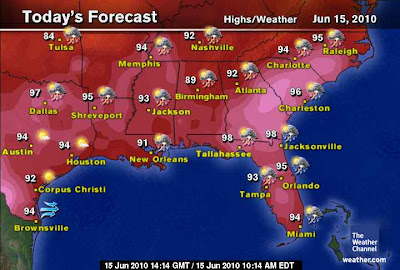 SOUTHEAST STILL CENTER POINT OF THE JUNE 2010 HEATWAVE BUT SIGNS OF COOLING IS SHOWING ALONG WITH BETTER T-STORM POTENTIAL FROM LOUISIANA TO WEST GEORGIA.