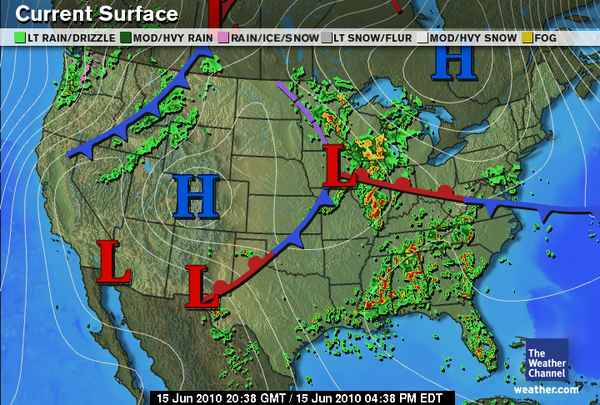 Unfortunately I have nothing new to tell you folks of the northern plaind and midwest. An area of low pressure and associated cold front will push west to east across the northern tier, helping instigate widespread showers and storms for many areas. High today may be slightly higher than of recent days with upper 70s reaching in North Dakota and low 80s in South Dakota, where sun is more prevalent. Minnesota and Wisconsin should see periods of rain and cloudiness with perhaps outbreaks of sunshine with highs running into the mid-70s. Areas further south and east from Chicago to the Mid-Mississippi valley, including St Louis, will see thunderstorms rather than plain rain showers as the air is warmer and more humid. Highs in the mid-Mississippi Valley should push into the 80s with upper 80s in St Louis to upper 70s for northern Illinois and Indiana. Mark’s City-Cast as follows. Bismarck, Hi 79, Lo 59 (partly cloudy), Minneapolis, Hi 75, Lo 55 (chance of showers and storms), Chicago, Hi 77, Lo 58 (chance of showers and storms), St Louis, Hi 87, Lo 72 (sunny but chance of storms) GOOD NEWS IS, WE SEE DRYING OUT AND WARMER TEMPS TOMORROW AS SYSTEM PROGRESSES EASTWARD..
