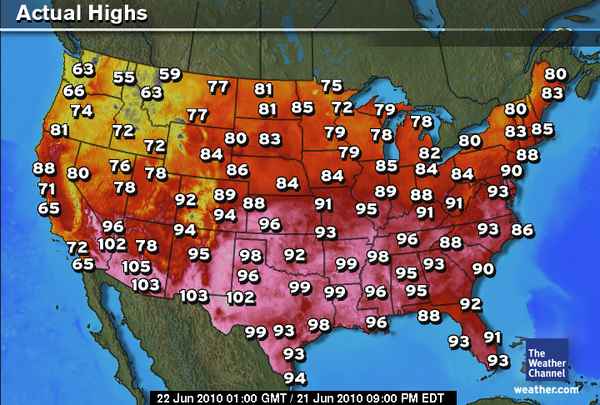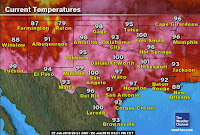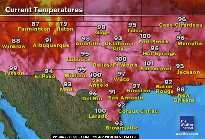 Texas and OK will bake in the relentless heat torturing this state. 100s for north-central Texas, upper 90s for Houston and inland areas, low 90s for the upper Texas coast (but extremely humid, dew points near 80 degrees) and upper 90s for West Texas, low 90s for S. Texas! Lows tonight range from low 80s from Galveston to Corpus Cristi, 78 for Houston, 80 for Dalass and mid to upper 70s everywhere else. Highs should range from 95 to 100 across much of Oklahoma, Kansas and into Missouri.