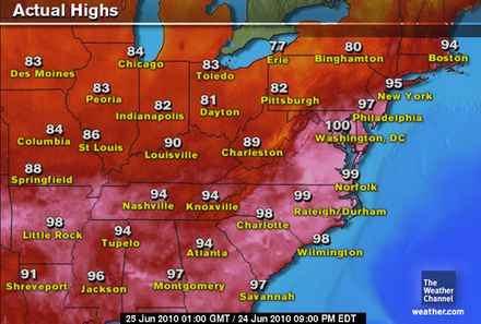 Mark’s City-Cast as follows: Washington DC, Hi 91, Lo 76 (sunny), Philadelphia, Pa, Hi 88, Lo 75 (sunny), New York, NY, Hi 85, Lo 73 (sunny), Boston, Ma, Hi 81, Lo 69 (sunny)