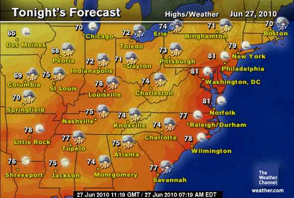 Storms over the interior Ohio Valley and Mid-Atlantic will oush towards the Atlantic, ahead of this front, the warmth will surge into the Northeast with highs ranging from around 100 for DC and Baltimore, mid-90s for Philly, low 90s for New York and mid to upper 80s for Boston. Those storms will knock on the door tomorrow in these cities. Lows tonight will generally run down to only around 80 degrees for downtown DC, Balt, Phila and New York!