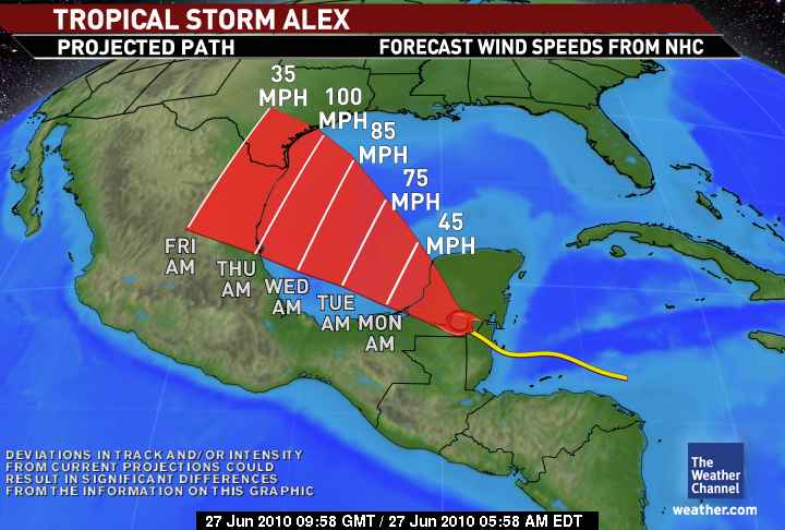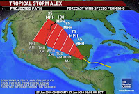 1PM REPORT: Alex maintains Tropical Storm Intensity over Mexico’s Yucatan, likely to make land fall near Tampico, Mexico as a Category 1 hurricane sometime Wednesday or Thursday
