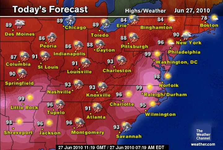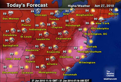 Bermuda High upstoppable across the Eastern States with highs that will rocket into the upper 90s with some 100s likely in North Carolina, Virginia (including Greater Washington DC) and even south Jersey today with warmest night of 2010 ahead tonight, Lows will likely fail to drop below 80 degrees from Downtown Washington, Baltimore, Philadelphia and possibly even up to New York City. Coastal North Carolina, Virginia and Delaware may see lows only drop to 81-84 degrees, where coastal waters of the Atlantic as well as coastal inlets and bays have water temps now into the middle 80s.