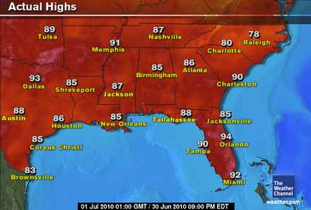 A relatively cool day from south Texas with daytime 80s and temps as low as upper 70s for northwest Texas. Highs around 90 for Dallas.