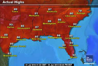The influence of the large trough now over the eastern half of the nation is allowing lots if sunshine and comfortable highs throughout the Southeast. Only the Gulf coast and as usual Florida will see thunderstorm development. Highs today will bearound 86 for Atlanta with sunshine, lows around 72 whilst New Orleans has an increased storm risk as usual for the time of year with a high around 83 degrees which is below normal and quite nice compared to recent times. Lows in N.O. shuld hover around 74 degrees tonight with storms lingering. Florida will see storm chances throughout the state with highs ranging from 86 and lows of 75 at Jacksonville to highs of 90 at Orando and lows of 74 to Miami with highs around 91, lows around 78-80.