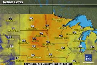 Note the 74 at International Falls and 77 at Fargo for the low. Lows tomorrow morning should be comparable if not a little warmer as dew points are around 70 even at Duluth…