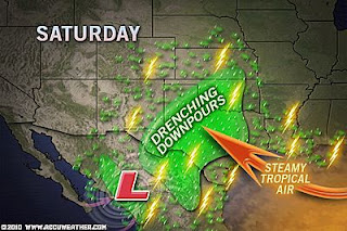 An uninterupted channel of TROPICAL air and associated tropical downpours are likely once the air heats up this afternoon all the way from the western Gulf of Mexico to North Dakota and all points between. High today range from 92 at both Denver to St Louis in the south with storms likely for Denver, sunshine for St Louis to 87 at Bismarck, North Dakota and 92 for Minneapolis, both cities to the north have a 40 to 50% afternoon thunderstorm chance…. So, St Louis all the way to Chicago should see sunshine and be east of the main tropical pump which should impact further west. Amazingly, dew points will be of Gulf Coast levels all the way to Minneapolis and across to the western Dakotas, fuelling those tropical downpours and all thanks to Alex’s remnants. Lows tonight range from the 50s across the western Plains to mid-70s from St Louis to Chicago and up to Minneapolis.
