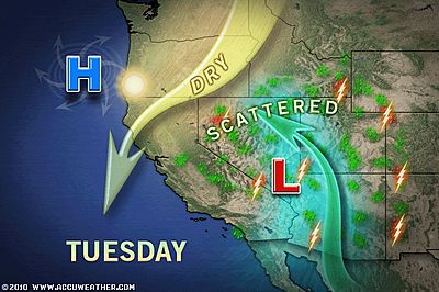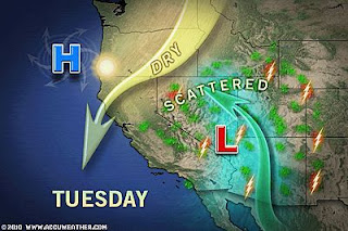 On the other side of the country, the weather is mirrored as another large and deep trough has carved out the atmosphere over the Great Basin and West Coast, drawing cold air aloft south and into the trough. This cold air aloft and surface warming into the 90s, even low 100s in desert valleys are creating enough instability to produce some strong thunderstorms. These thunderstorms are created as a tropical air flow is being pushed up from the east Pacific and even Mexico, some of these thunderstorms are and have turned severe with damaging winds, dangerous lightening and even isolated pockets of flooding rains.