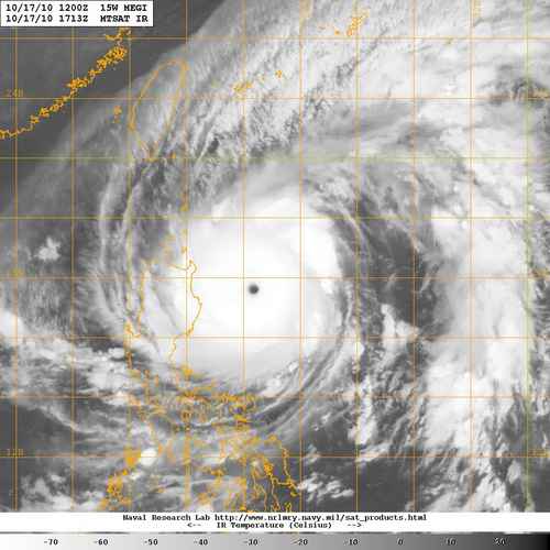 JTWC Report:”MEGI HAS INTENSIFIED TO THE UPPER REACHES OF SUPER TYPHOON STRENGTH. CURRENT DVORAK EYE FIXES FROM PGTW AND RJTD ESTIMATE MAXIMUM SUSTAINED SURFACE WINDS HAVE ELEVATED 10 KNOTS FROM THE PREVIOUS FORECAST TO 155 KNOT.