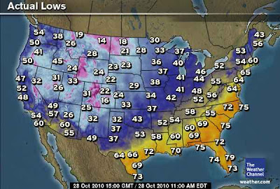 It always amazes me at how a major storm system can not only bring amazing “direct” impacts in the form of wind, rain, snow, severe weather etc, but when looking at the larger weather map, you almost always get a stunning contrast and array of temperatures. Whether it be March or April or indeed October, there are always 1) a large contrast between warmest high and coldest high in the nation, just look at the map above, note the well below normal, 32 degree high at Bismarck, ND, then look down to Houston, TX, they topped a much warmer than normal 94 degrees, then of course just a degree warmer, Del Rio, TX to the west of Houston on the Texas-Mexico border topped a toasty 95 degrees for a national high for the day! 2) I always love the sharp flip in temperature, when you get a strong cold front (particularly in March over recent years) areas, especially in the Plains where temperature may be in the 70s, 80s or in extreme cases, the 90s and within a few hours, the bottom drops out, the front has passed and it’s all of a sudeen dropping through the 50s, 40s, even 30s and yes, quite often the snows will fly!