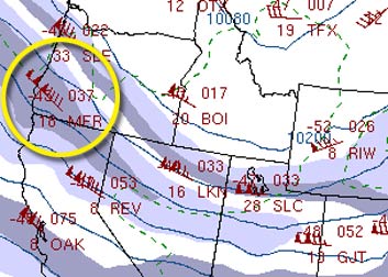 The circled area over southern Oregon, near Medford, indicates wind speeds at the level of the jet stream of near 220 mph on Monday morning.