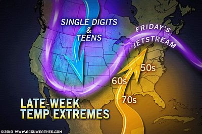 As you can see from the AccuWeather graphic below, a new trough will dive into the heart of the Great Basin around New Year bringing a surge of frigid air down from the Arctic. At the same time, ridging will counteract the western trough and thus 60s and even 70s will rule the Southeast with 40s and 50 stretching northeastwards into the Northeast.