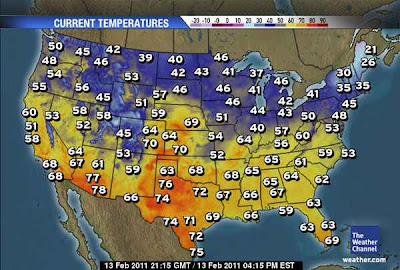 On February 9th the high was 18 degrees, Low 7, on the following night (10th) the low fell to -5 but 3-days later on the 13th it rose to 68 degrees.