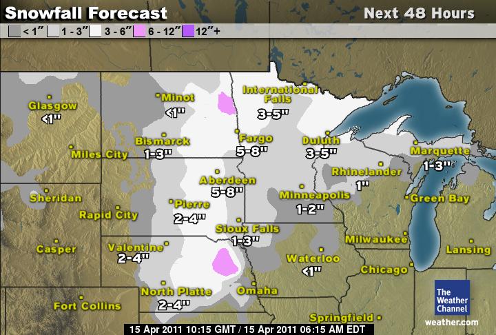 While all the nasty severe weather is occuring across the south, heavy snows will pick up, along with cold, northwest winds later tonight and through tomorrow. Below is estimated totals from The Weather Channel for the next 48 hours.