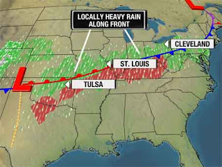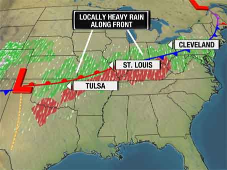 Moisture is pouring out of the Gulf and with a collision drapped across the heartland of the country in the form of a front, this moisture is being sucked into a towering wall of convective cumulonimbus towers that are energized by a strong northwest jet stream, chilly, dry air that’s being blown in on the storm’s rear and the warm, south, east surface wind. These two very different origins of air, the rotation of the low and varying directions of flowing air is creating the spin for strong but regular thunderstorms to transition to rotary supercells. The thunderstorms forcing piling air upwards where it literally forces more moisture and thus dumps heavier rains. This process will commence ‘training’ of these storms because of a slow movement of the cold front from Texas all the way to the Mid-Atlantic which will see a uniform 1-2 inch rains across northeast Oklahoma, much of southern Missouri, southern Illinois into the hilly terrain of Kentucky and Tennessee where there is flash flood concerns over this 2 to possibly 3 day event.