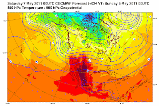 By this stage, a storm system will have developed to the lee of the Rockies with a cold front aligned along the thermal boundary which seperates the warm from cold. The howlling northwest flow aloft, the hot, dry south flow blowing up from the Mexican plateau and a northwesterly surface flow of warm, moist air out of the Gulf could all combine in the varying altitudes of the atmosphere to produce rotation of thunderstorms which fire up along the front and this would indicate supercell thunderstorms.