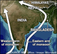 The Northernmost regions are not directly “in touch” with the SWM, and actually get their monsoon moisture only when the western end of the monsoon axis shifts to the upper most western regions, adding extra moisture to the Intertropical Convergence Zone (ITCZ), referred to as the monsoon.