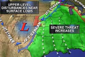 So, to sum things up. Though the three areas mentioned above for thunderstorms today may see some faurly strong to locally severe, IT’S TOMORROW THAT WILL SEE THE SEVERE THUNDERSTORMS MORE WIDELY AND DEVELOP MORE EASILY across Texas, through the South and up into the Ohio Valley, with the upper low meeting and stacking over top of the surface low. I shall have more details tomorrow so check back here tomorrow.