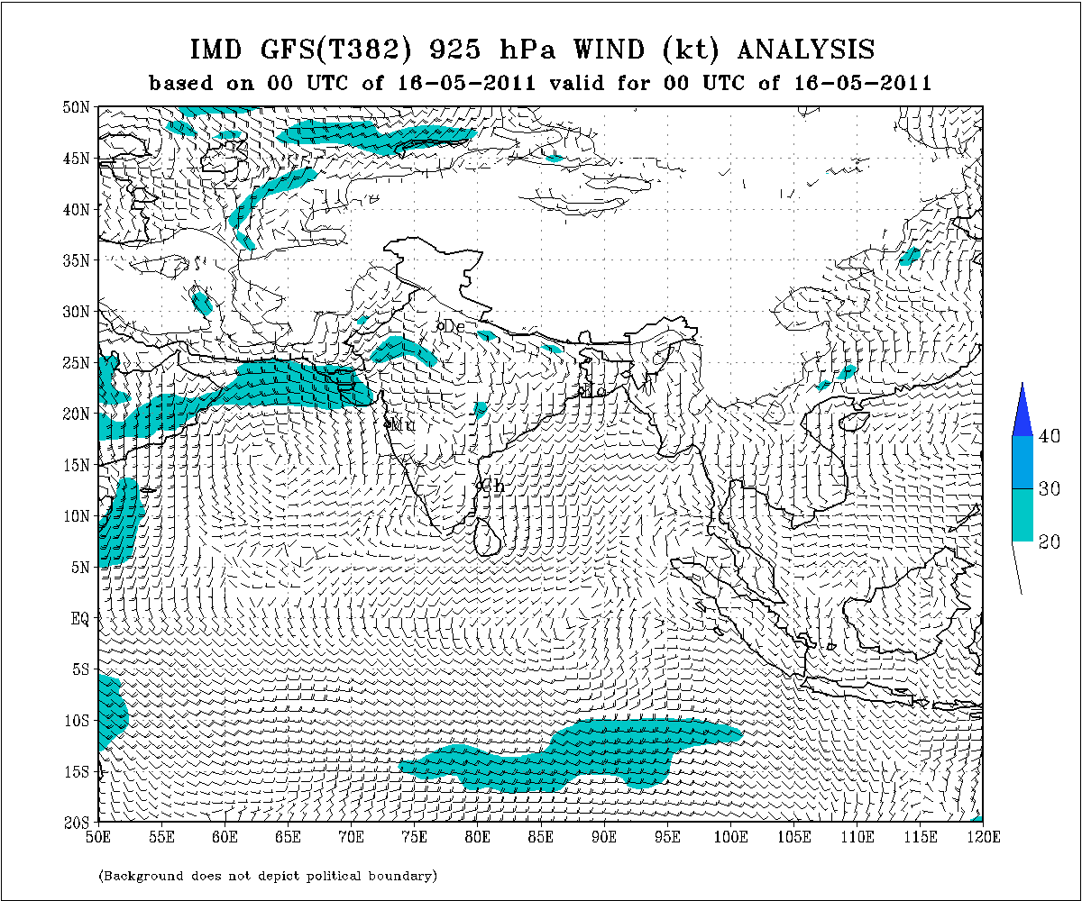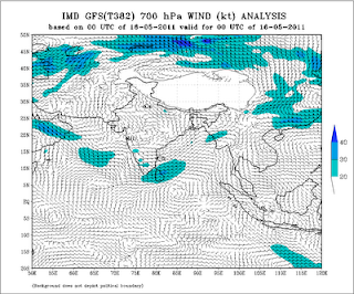 Today, in the Arabian Sea,barring the N.Konkan area, the situation is much in tune. We see the winds getting weak after crossing Gujarat.(925 winds map above).