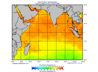 Cross Equatorial Flow has picked up considerably in the Arabian Sea. Winds over 30-35 knts are seen gushing Northwards off the Somali Coast.