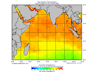 Today’s SST map is reproduced here to show the Sea temperature falling along the Somali coast. It is presently around 26c. Now, this difference with the Central Arabian Sea plays a key role in cloud formations in the Central Arabian Seas. The SST along the Somali coast will rapidly fall to around 18/20c in the next 15 days.
