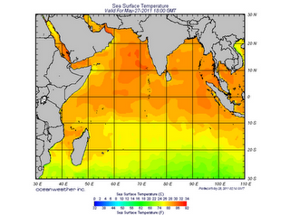The cross equatorial winds are getting stronger off the Sri Lanka coast. Vagaries had advanced the SWM in the western and southern areas of the island on the 26th. See Sat Image .Now, with the SW winds crossing 30 knts today, the SWM can be expected to cover the