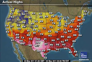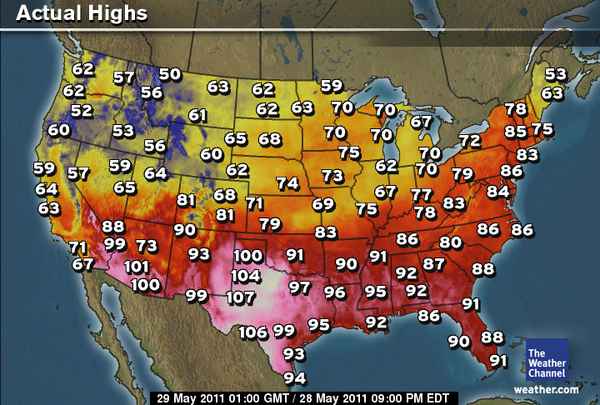 These where the highs reached today across the United States (see map below), what a differnce compared to recent weeks isn’t it? The scorching heat that’s been pumped north of the Mexican Desert baked Texas well into the 100s for a decond straight day with yesterday’s peak being 111 degrees at Dryden, Texas and today, 112 degrees at Laredo. This heat was hottest south of the border. According to the University of Cologne’s North America high temperatures for today, the Monterrey area of northeast Mexico broiled at 115 degrees.