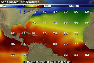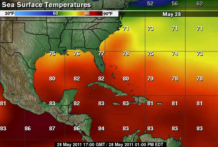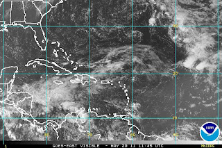 There is currently some stirring and clustering of clouds showing up on satallite imagery over the western Caribbean Sea. The atmosphere remains too hostile for these cloud clusters to develop into a closed-rotary circulation in which a warm core can be formed, however, both a relaxing of upper winds and models suggesting development, over the next 7 day period, we may be looking at the eseedlings to our first named system of the new season which starts on Wednesday (June 1st). A high built up over Cape Hattaras by midweek and lowering of pressures over the Caribbean Sea would suggest more incubation for this ‘wave’ to begin developing. I shall be keeping a close eye on this western Caribbean feature throughout the week and keep you posted as to whether this will develop into perhaps the first named system of 2011.