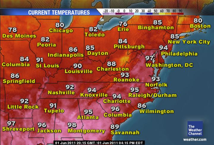 As you can see from the current temperatures over the East this afternoon (below), it’s another hot, humid day with plenty of mid-90s showing up from Washington up into Baltimore and Philadelphia. It’s gotten even hotter today than of late across the interior Southeastern states. Notice the mid to upper 90s with even a chance of some 100s showing up. As the storm system treks up over southern Canada and pushes down on the strong upper level ridge which has produced all this heat, this will force cooling over the Lakes and into the Northeast, but pressures will actually be pumped up over the Southeast in reaction to a weakening of the high on it’s north flank. Like we’re seeing this afternoon with hotter surface temperatures throughout the South, this heat will continue to be as intense in the coming days with a trough dipping into New England and highs drop into the 60s rather than 80s across New England, 70s rather than 80s around NYC and 80s rather than 90s for Philly south to DC.