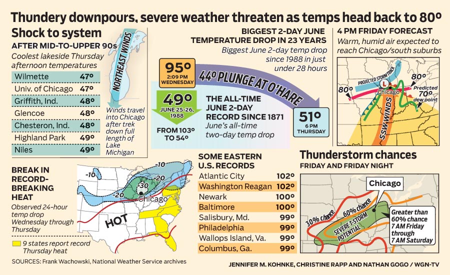 Temperatures plunge from the 90s to the 50s; largest 2-day June temperature drop in 23 years