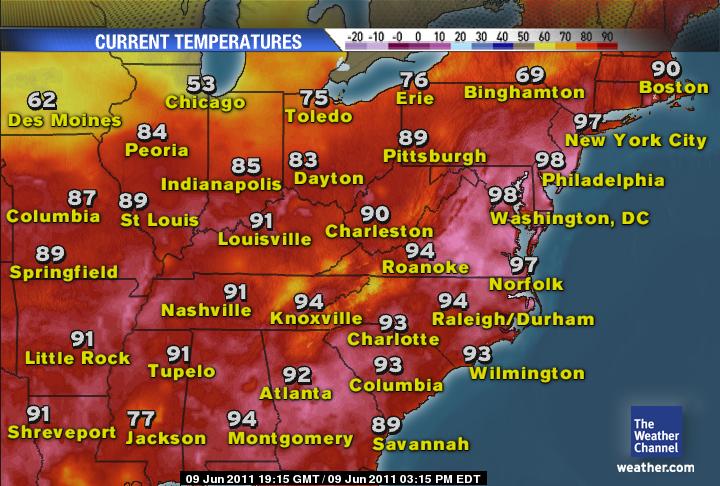 The below graphics are the current temps across the East Coast and it’s brutally hot out there, dangerously hot! Strong to severe storms are blowing up over the Ohio Valley just now and pushing eastwards, clearing out the air behind it. While it reached a near record 95° yesterday at Chicago’s O’Hare International Airport, powerhouse thunderstorms rolled through during the overnight hours thanks to a front which has whipped out the hot, steamy air and replaced it now with near autumnal air. It’s currently 53° in Chicago right now while it was well into the 90s at this same time yesterday….