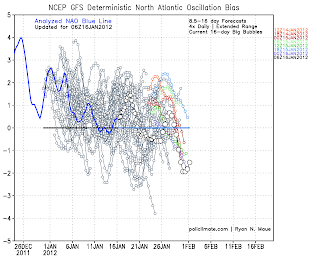 These are two of the latest charts off Dr Ryan Maue’s site.. policlimate.com which clearly show the downward trend since Christmas of both the Arctic Oscillation and North Atlantic Oscillation. Two key indicators for not only cold across the mid-latitudes but for cold pool development and persistence over eastern North America and Western Europe. Both show a negative phase from around Jan 26. onwards and this along with models show the re-release of Arctic air following the next 7-10 day cold period followed by brief warming. Blocking over Greenland is looking more likely into February and may mean the coldest month for most.
