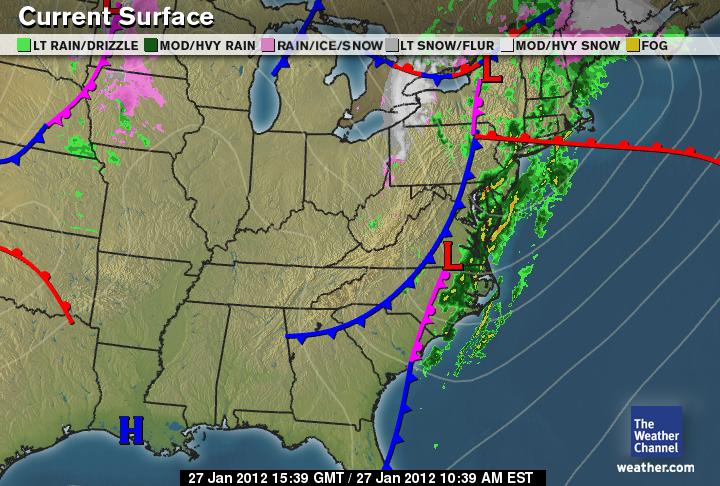 Friday is a real messy one up the East Coast thanks to the presence of a cold front which is drawing cooler air in on the backside from the Midwest/Ohio Valley and pullung warm, moist air north along this front, so, while it’s a soaking morning and early afternoon, winds are blowing strong and temps have been rising into the unusually mild upper 50s to low 60s up along the Philadelphia to New York City stretch of I-95. Just north of NYC lies a warm front and to the north of this, the air is cooler, thus explaining why NYC is in the upper 50s today while Boston won’t get out of the mid-40s. Further north into New England we see a rain of rain, freezing rain and snow up over northern New Hampshire and Maine.