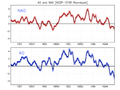 The computer models for the best part of 2-3 weeks now has seen an eventual flip from positive into negative in both AO and NAO. This if trends are persistent would tell me that a change in the largescale pattern eventually was likely.