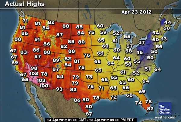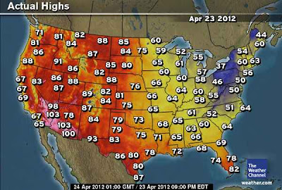 Yesterday saw highs top 113 degrees at Death Valley, CA, 2nd such high and 2nd day in a row at tying the all-time April record, 91 at Boise, ID, 88 at Salt Lake City, 88 at Glasgow, MT and today will see near 90 at Denver, CO..