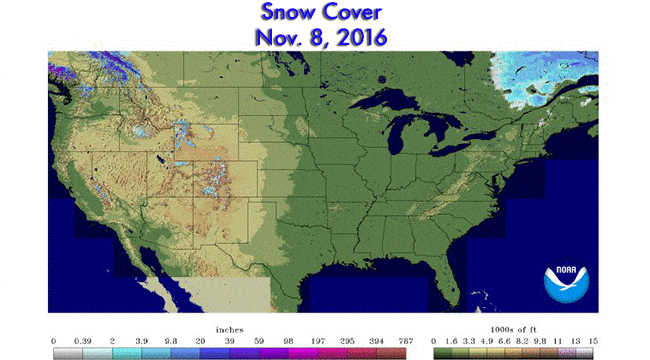 Snow cover analysis on November 8, 2016, over the Lower 48 states.
